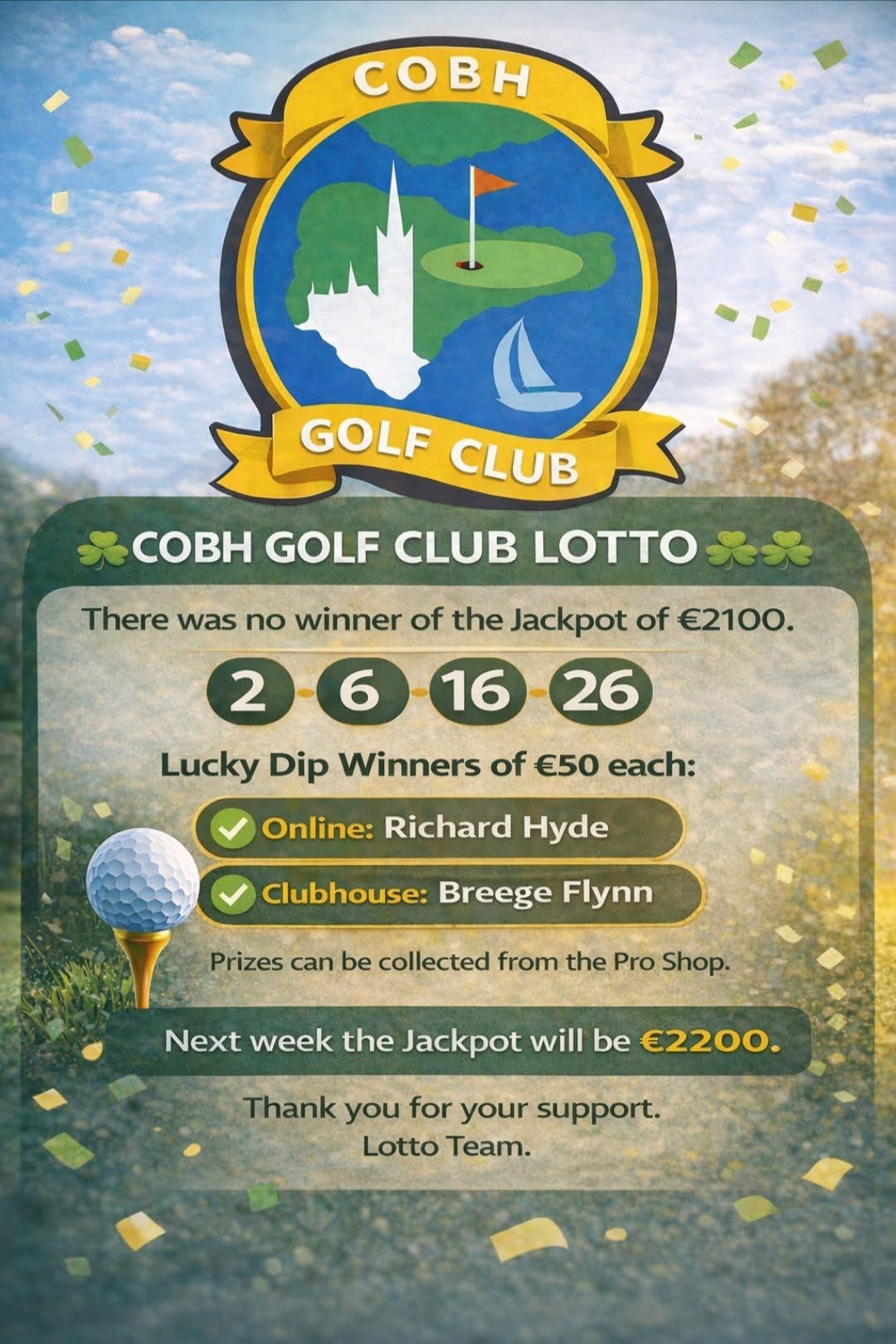 There was no winner of the Jackpot of €2100. The Four Numbers drawn were :2-6-16-26. Lucky dip [...]