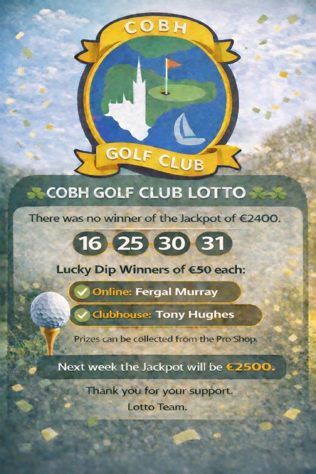 There was no winner of the Jackpot of €2400. The Four Numbers drawn were :16-25-30-31 Lucky dip [...]
